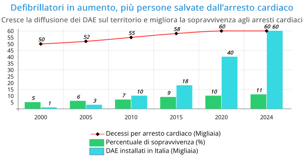 | Arresti cardiaci extraospedalieri in Italia (~60.000/anno) | https://pmc.ncbi.nlm.nih.gov/articles/PMC9663528/? |